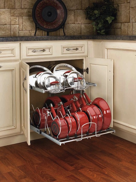 这个由Rev-a-Shelf设计的架子的重点在于它两层独立的架子和可调节的分隔栏,让你的炊具摆得稳稳当当整整齐齐。滑轮承重100磅,能放的炊具还挺多的吧。