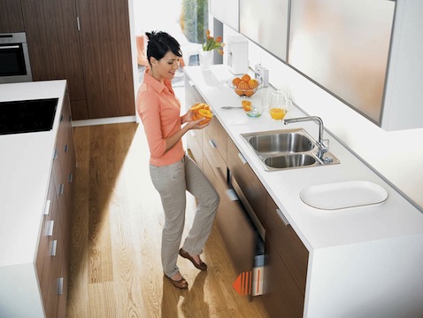 抽屉式垃圾箱其实并不是新鲜的设计。但这款由Blum设计的SERVO-DRIVE垃圾箱系统,不需要你弯下腰去拉开它,也不会让你在双手都拎着垃圾时无所适从手忙脚乱,只要轻轻用膝盖碰一碰垃圾箱的抽屉,它就会自觉地打开了。